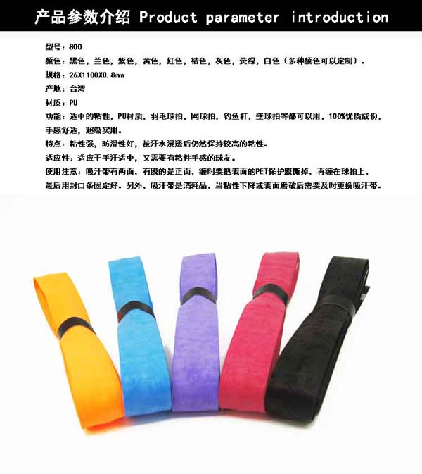 使用注意:吸汗帶有兩面,有膜的是正面,纏時(shí)要把表面的PET保護(hù)膜撕掉,再纏在球拍上,最后用封口條固定好。另外,吸汗帶是消耗品,當(dāng)粘性下降或表面磨破后需要及時(shí)更換吸汗帶。